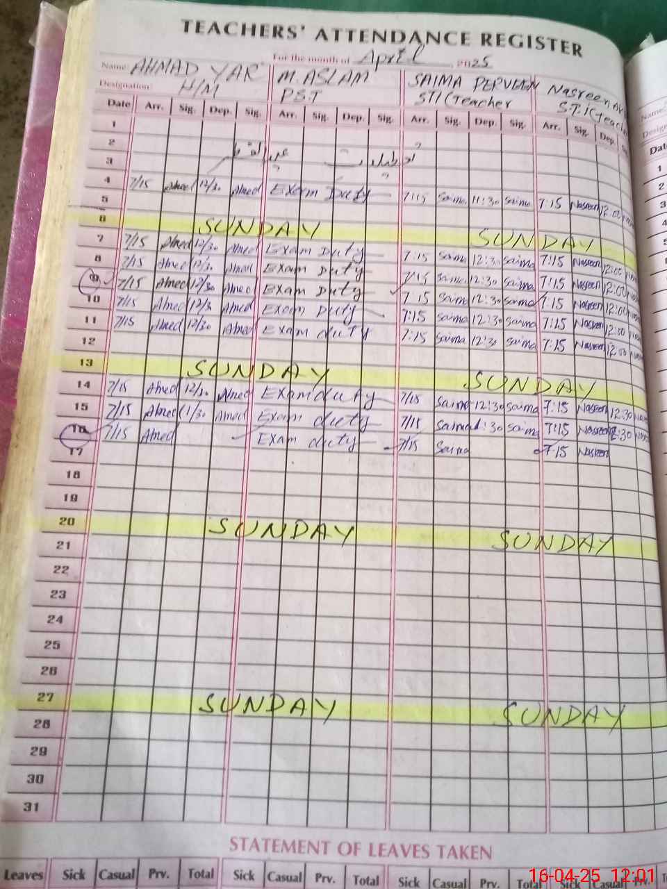 | 36**** | Mu**** As**** At**** | PST | Regular | 0 | 0 | 0 | 0 | 0 | 0 | 0 | 0 | 0 | Exam Duty |