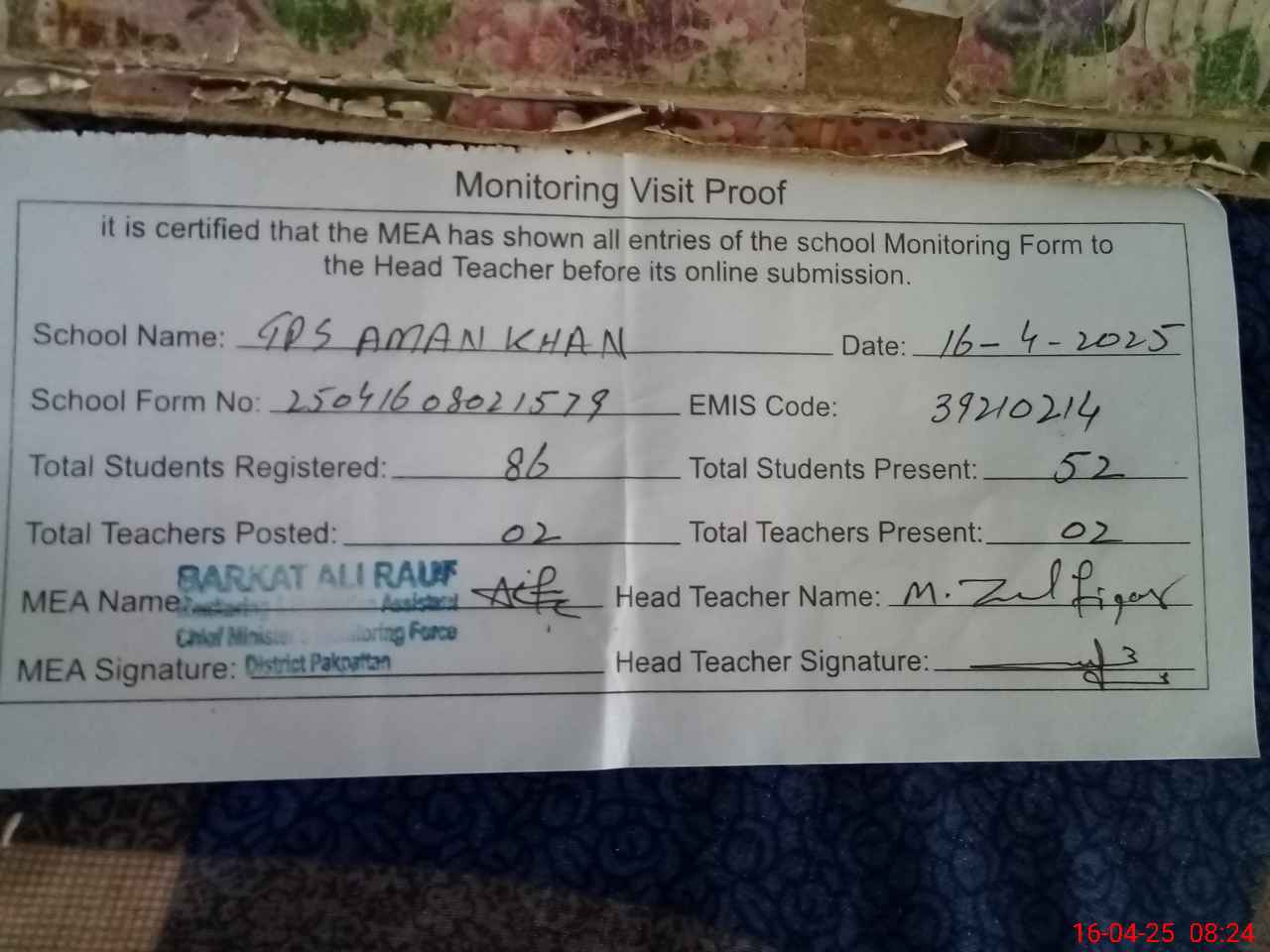 | Certified that this School was Inspected by the Undersigned MEA/DMO Today and the Information Stated Above is as Per Record. | |||||