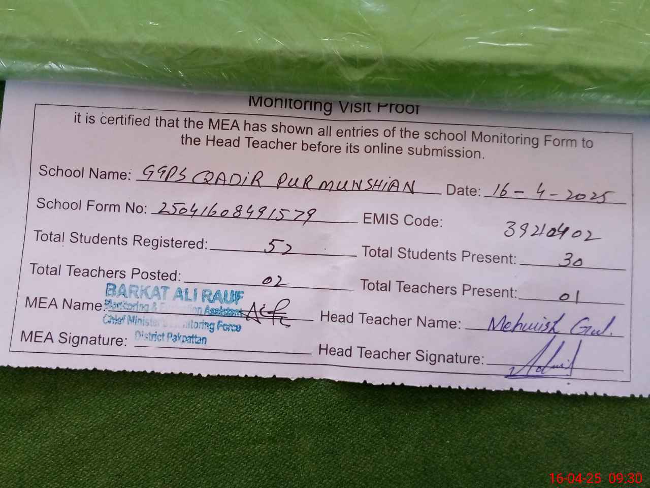 | Attendance Register | Head Teacher | MEA with School | Visit Proof |