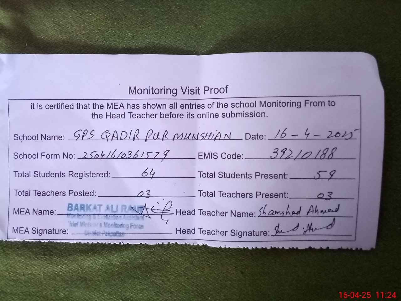 | EMIS Code: 39210188 | Name of School: GPS QADIR PUR MUNSHIAN PO PAKPATTAN | |||