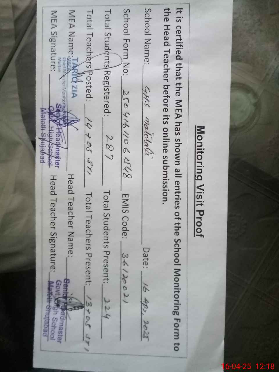 | Attendance Register | Head Teacher | MEA with School | Visit Proof |