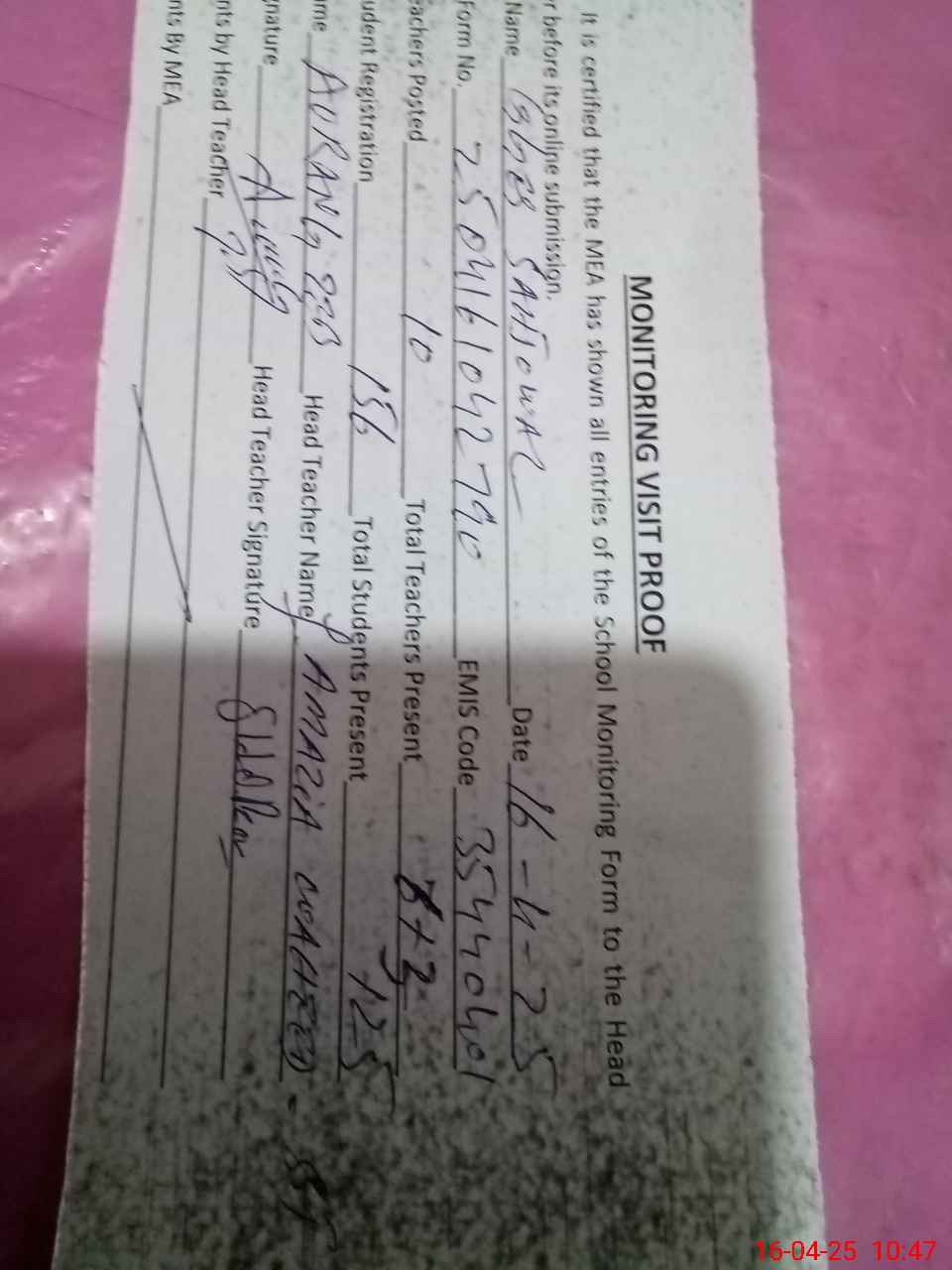 | Attendance Register | Head Teacher | MEA with School | Visit Proof |