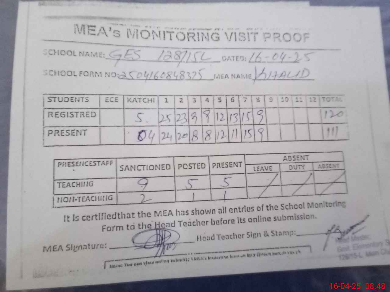 | EMIS Code: 36430198 | Name of School: GES 128/15-L, MIAN CHANNU | |||