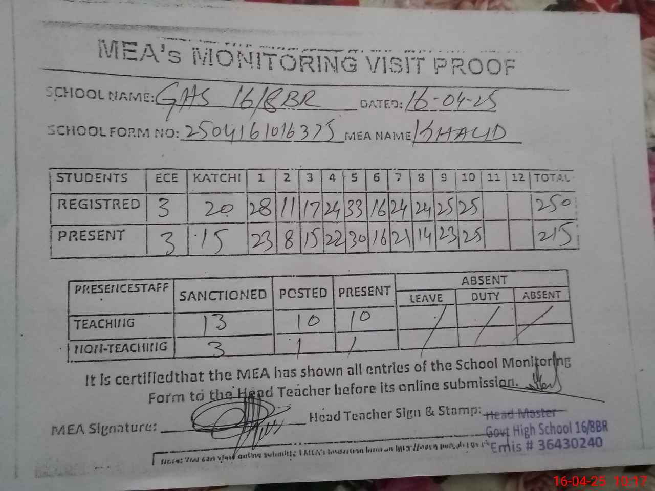 | EMIS Code: 36430240 | Name of School: GHS 16/8-BR, TULAMBA | |||