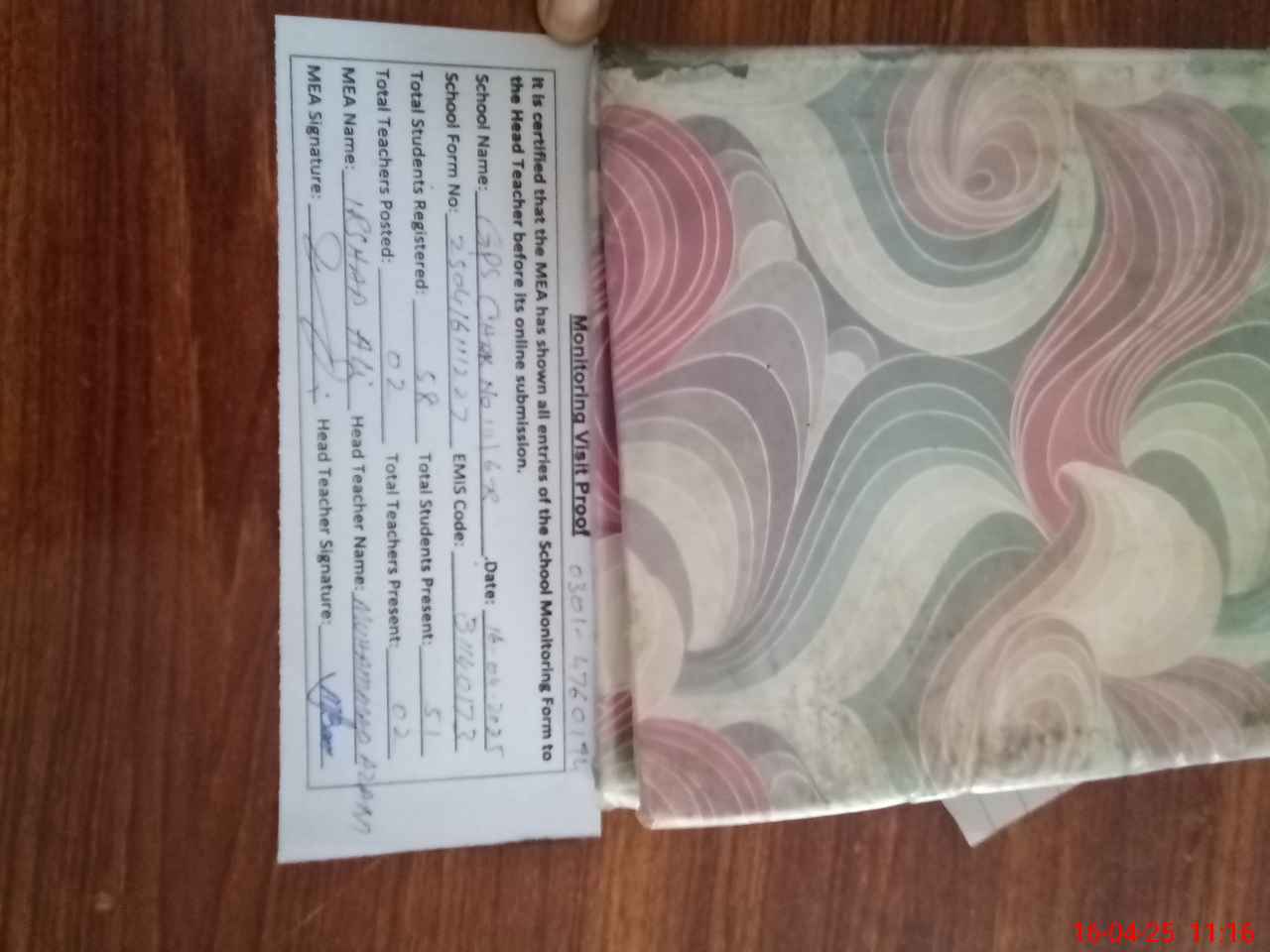 | Attendance Register | Head Teacher | MEA with School | Visit Proof |