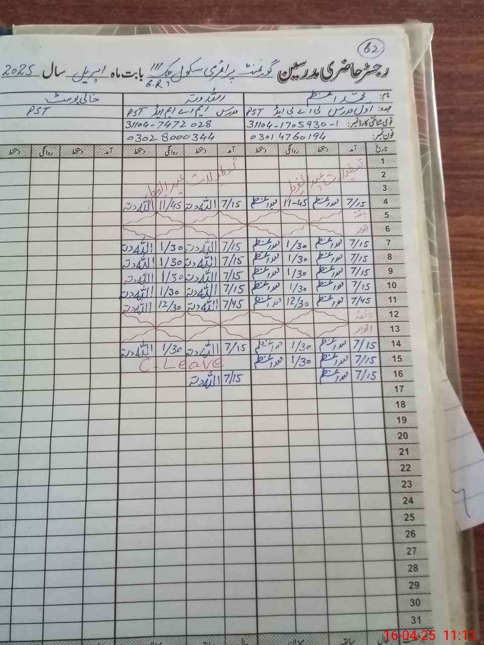 | Name: Mu**** Az**** Designation: (School Headmaster's/Headmistress's) PST Phone/Cell Number: 03**** |