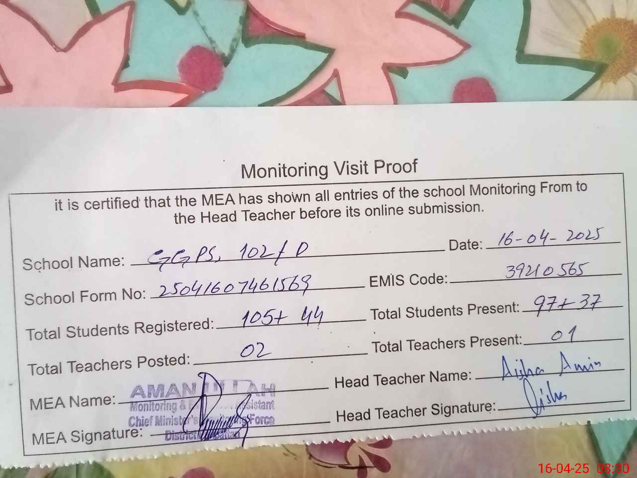 | EMIS Code: 39210565 | Name of School: GGPS 102/D | |||