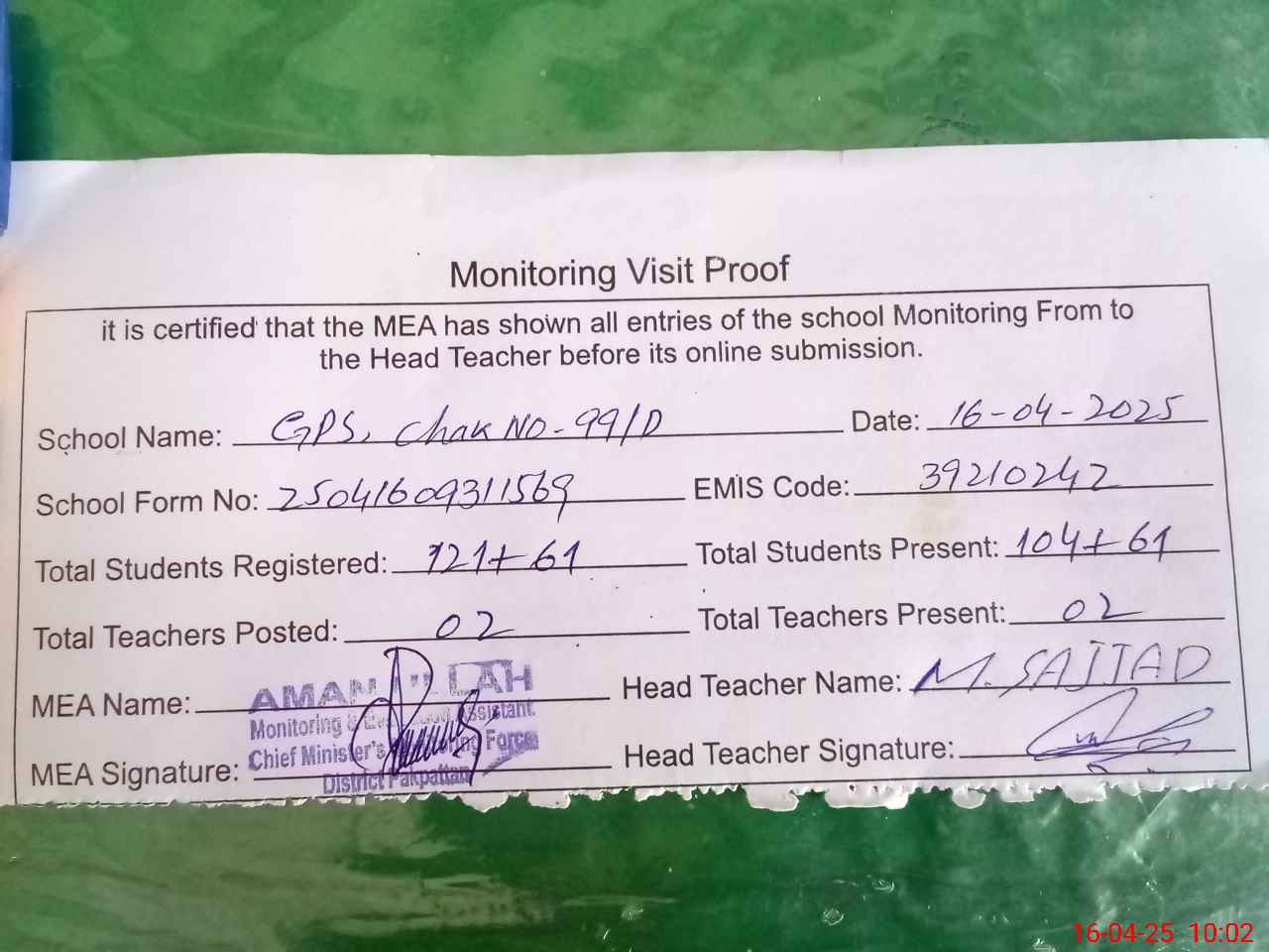| EMIS Code: 39210242 | Name of School: GPS CHAK NO. 99 D | |||