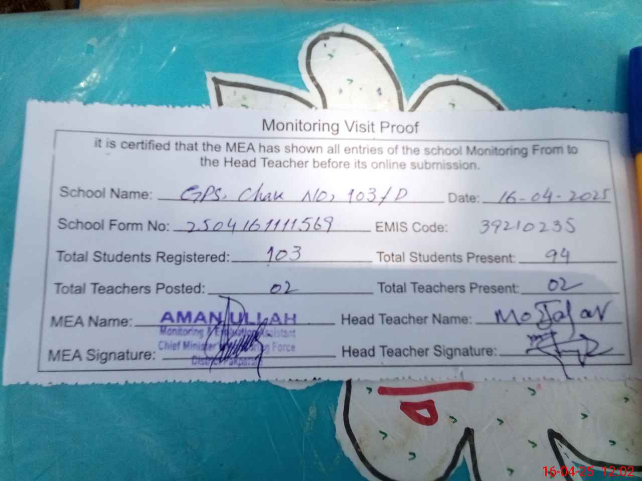 | Attendance Register | Head Teacher | MEA with School | Visit Proof |