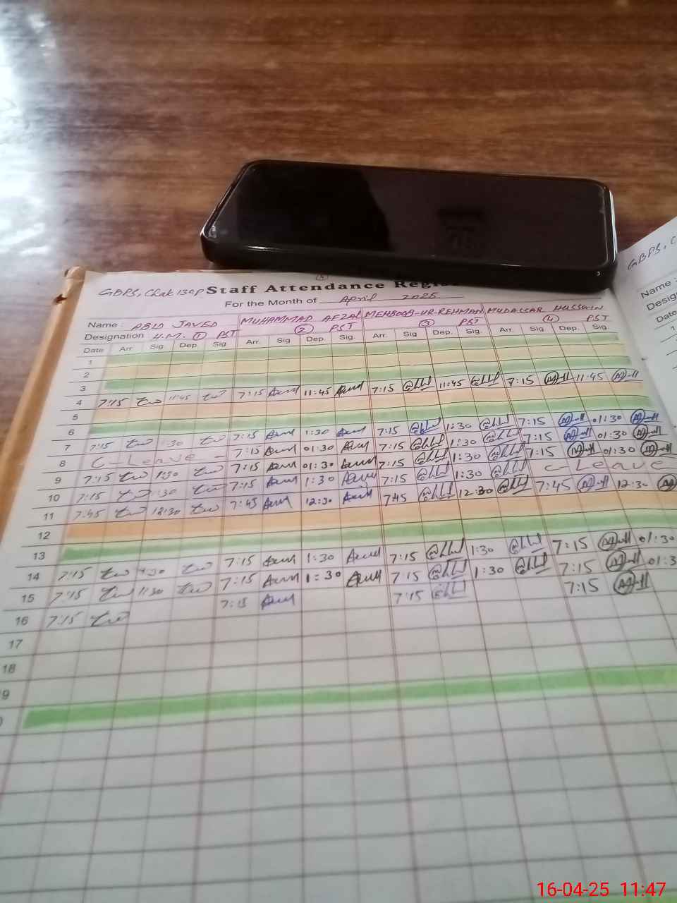 | CNIC | Full Name | Designation | R/C | Absence During Last Calender Month |