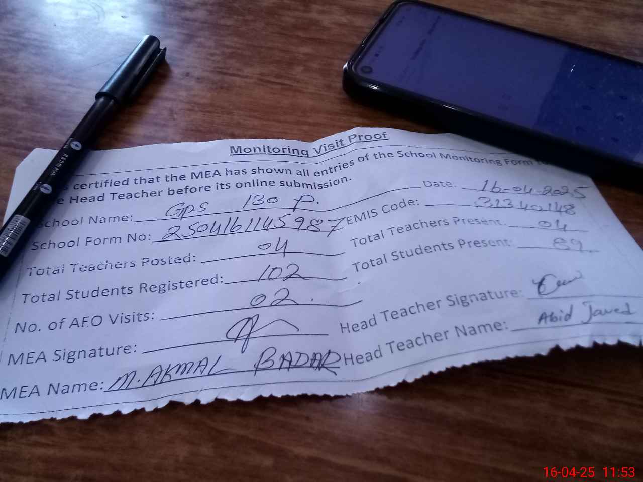 | Attendance Register | Head Teacher | MEA with School | Visit Proof |