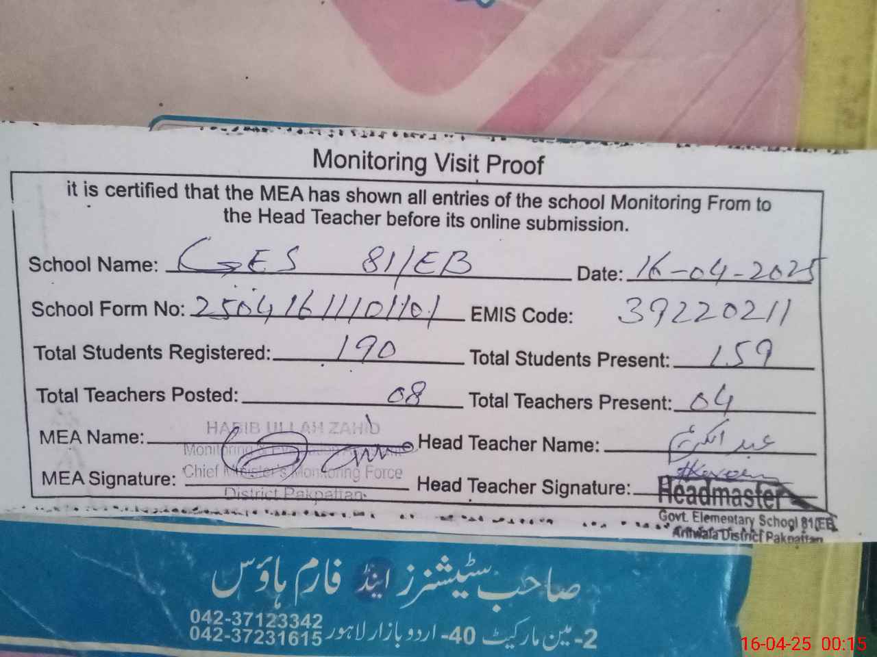 | Attendance Register | Head Teacher | MEA with School | Visit Proof |