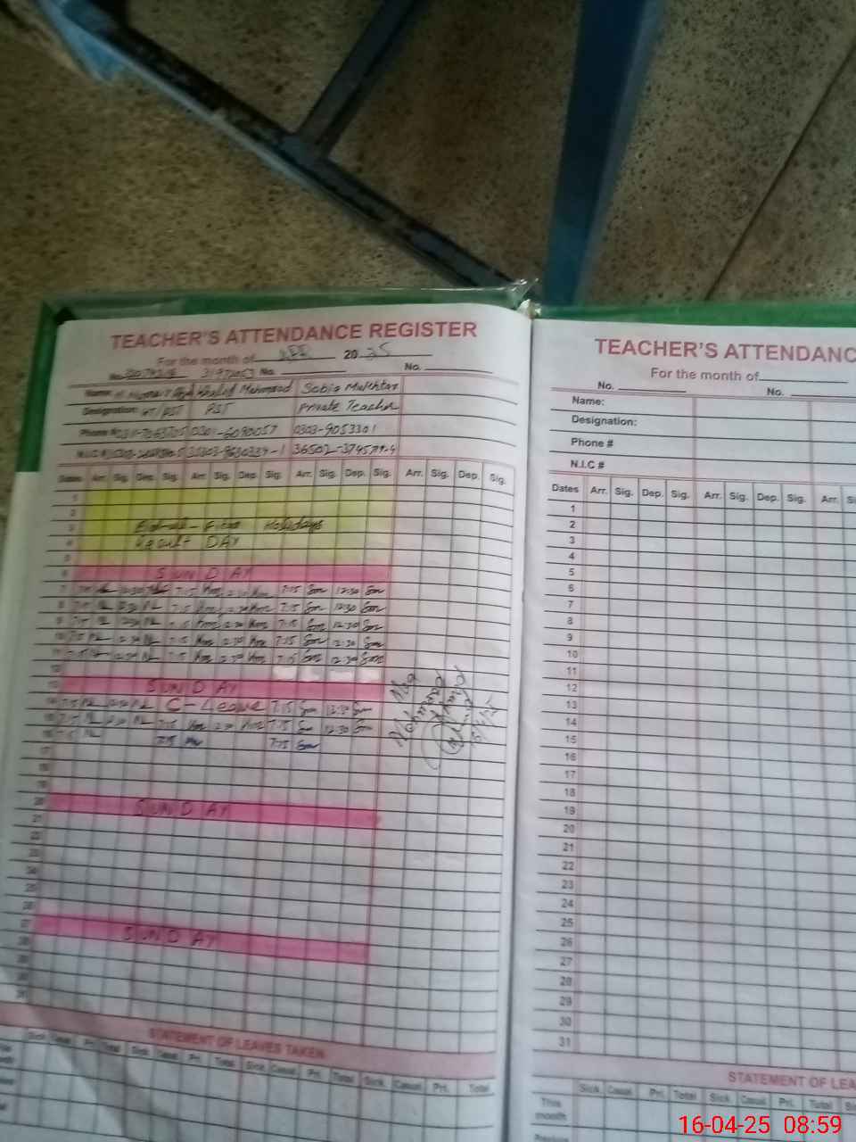 | CNIC | Full Name | Designation | R/C | Absence During Last Calender Month |