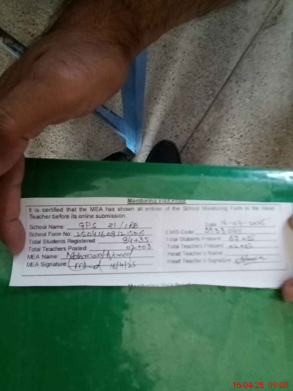 | Attendance Register | Head Teacher | MEA with School | Visit Proof |