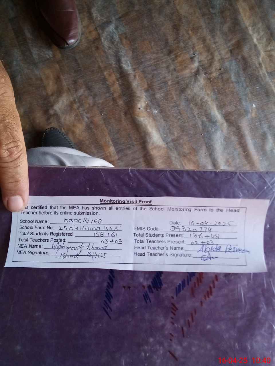 | Attendance Register | Head Teacher | MEA with School | Visit Proof |