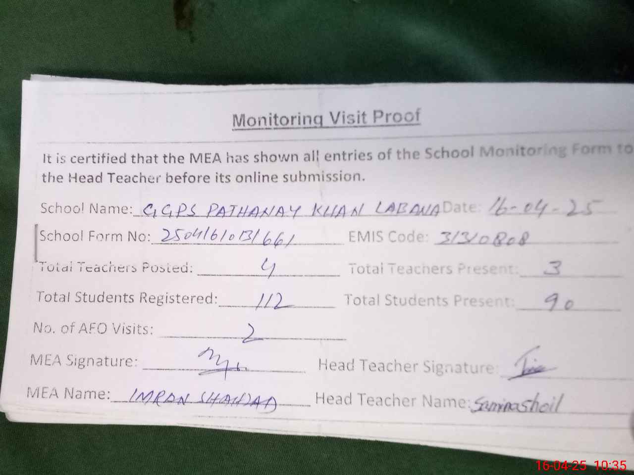 | Attendance Register | Head Teacher | MEA with School | Visit Proof |