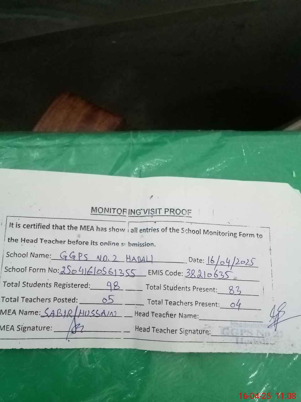 | Attendance Register | Head Teacher | MEA with School | Visit Proof |
