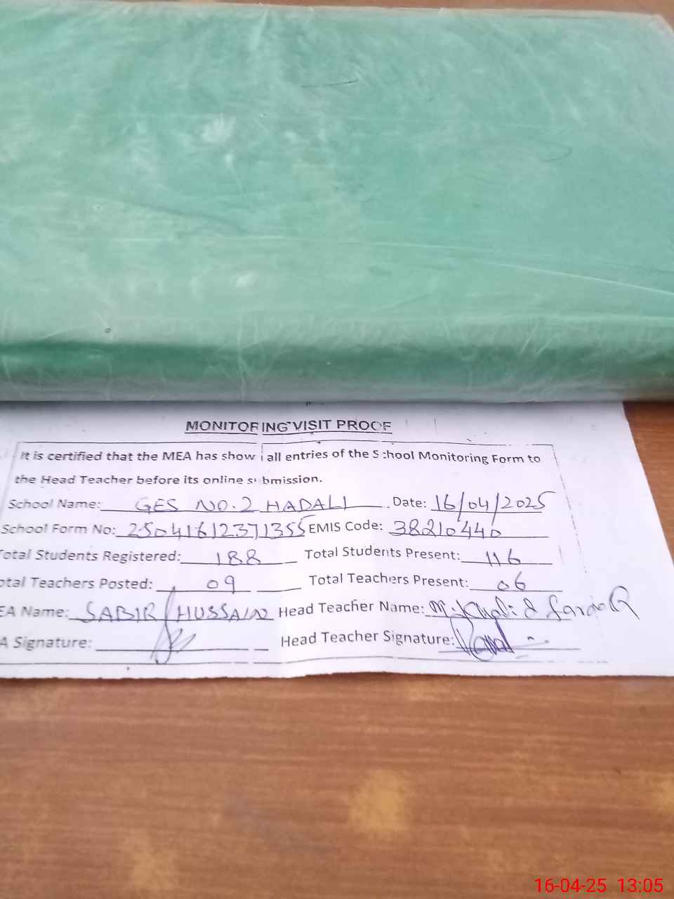 | Attendance Register | Head Teacher | MEA with School | Visit Proof |