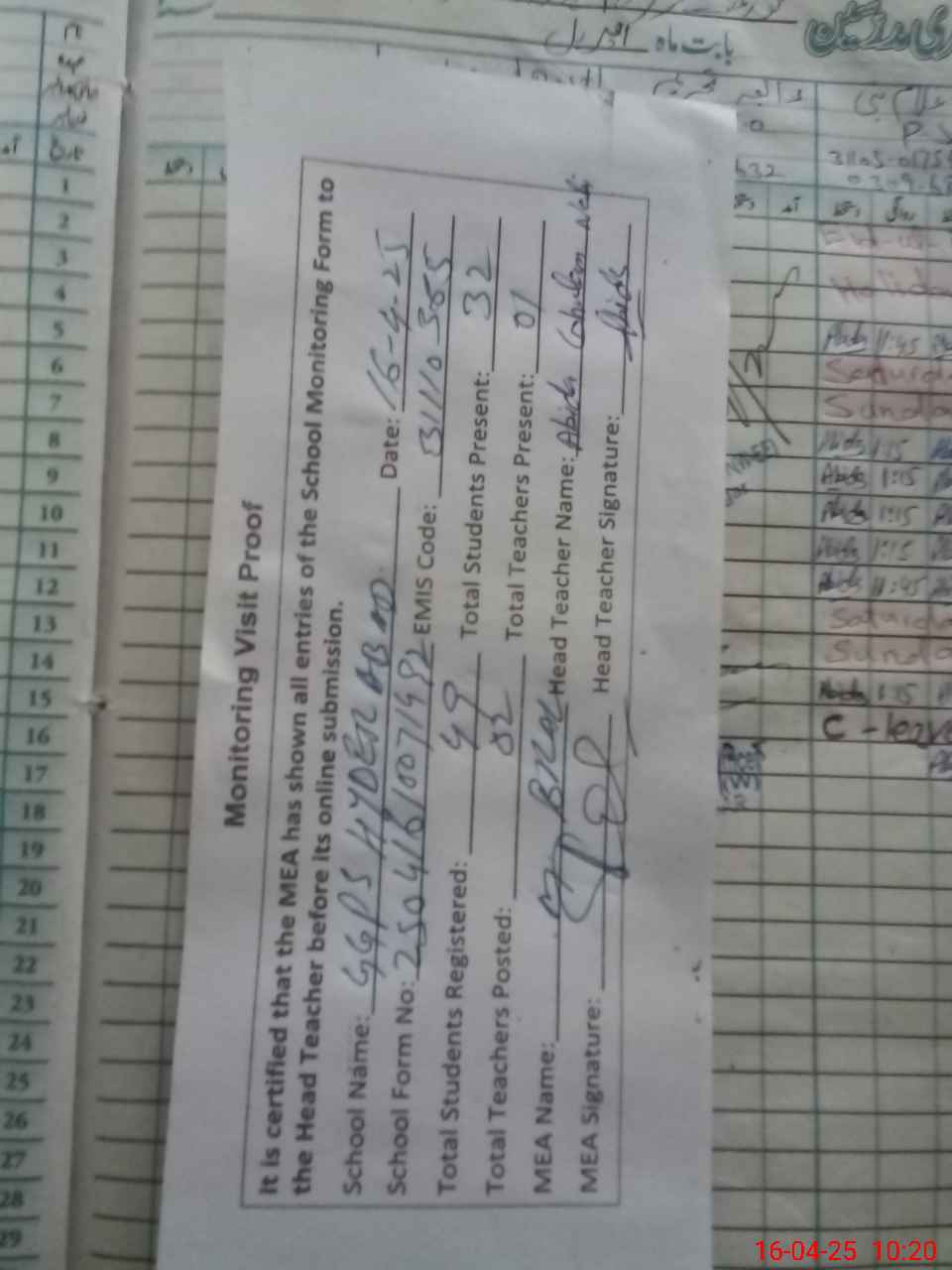 | Attendance Register | Head Teacher | MEA with School | Visit Proof |