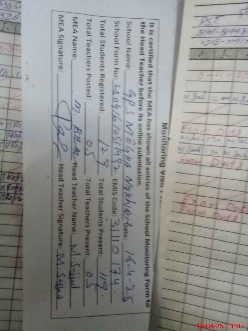 | Name: Mu**** Sa**** Designation: (School Headmaster's/Headmistress's) PST Phone/Cell Number: 03**** |