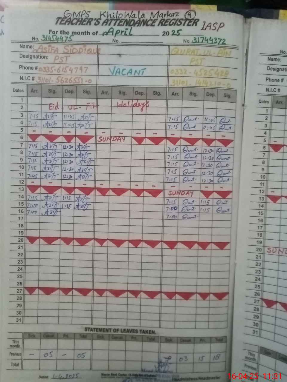 | Name: AS**** SI**** Designation: (School Headmaster's/Headmistress's) PST Phone/Cell Number: 03**** |