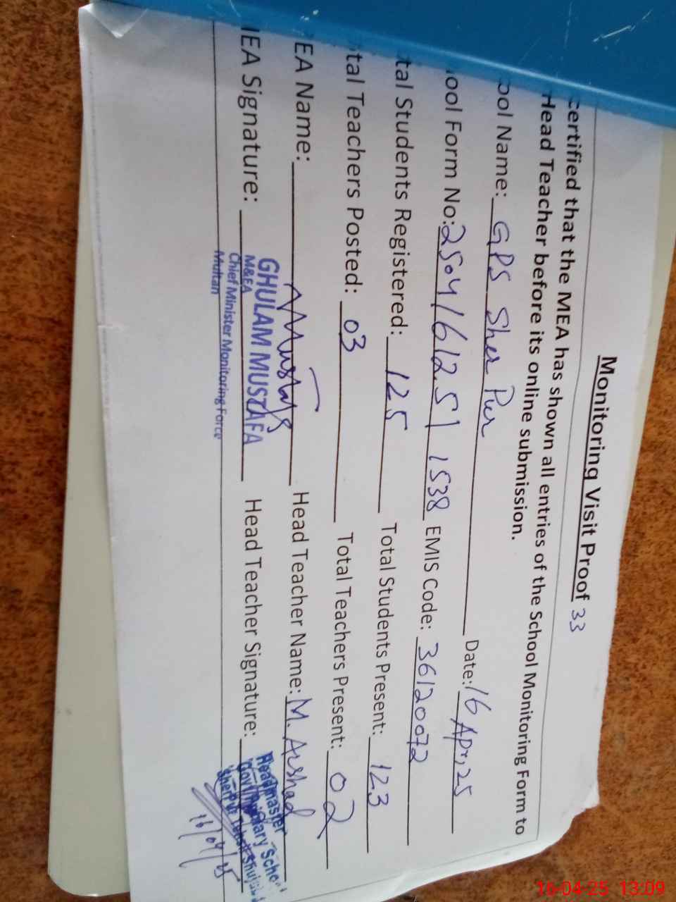 | EMIS Code: 36120072 | Name of School: GPS SHER PUR P/O & TEH SHUJABAD | |||