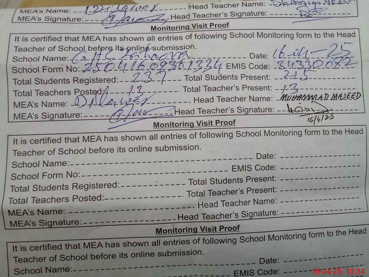 | Attendance Register | Head Teacher | MEA with School | Visit Proof |