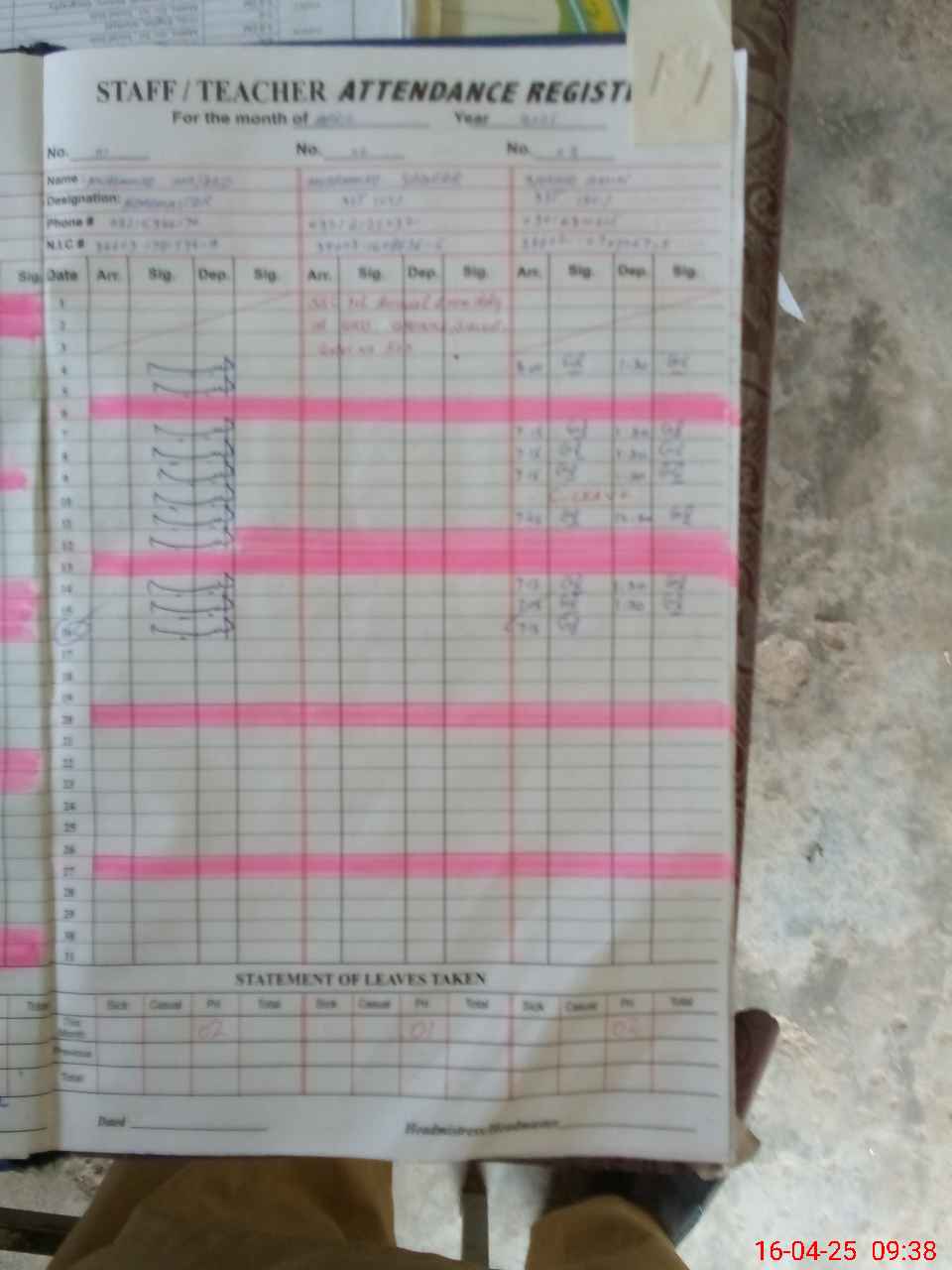 | CNIC | Full Name | Designation | R/C | Absence During Last Calender Month |