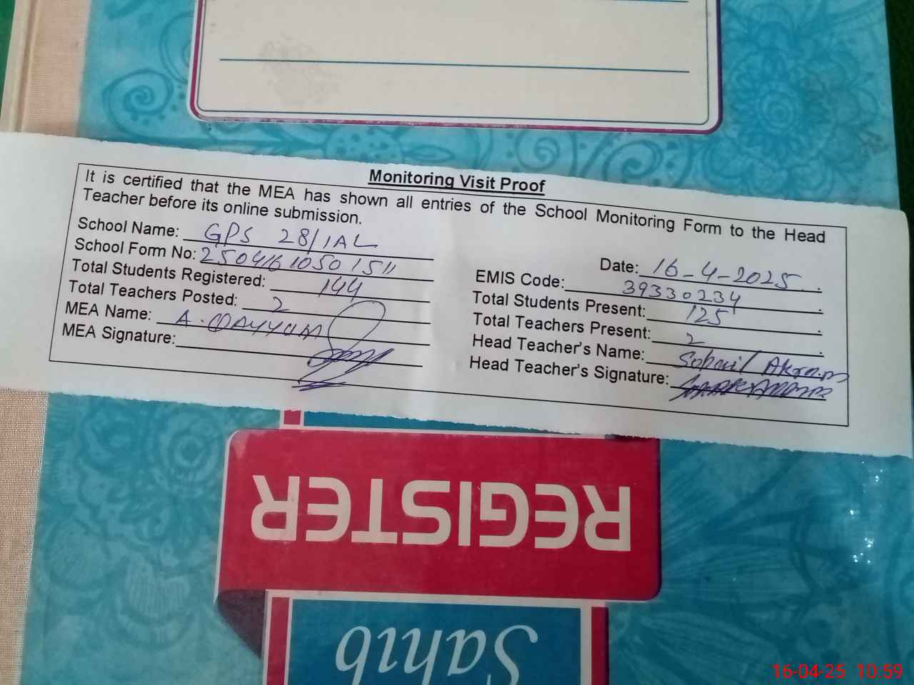 | Attendance Register | Head Teacher | MEA with School | Visit Proof |