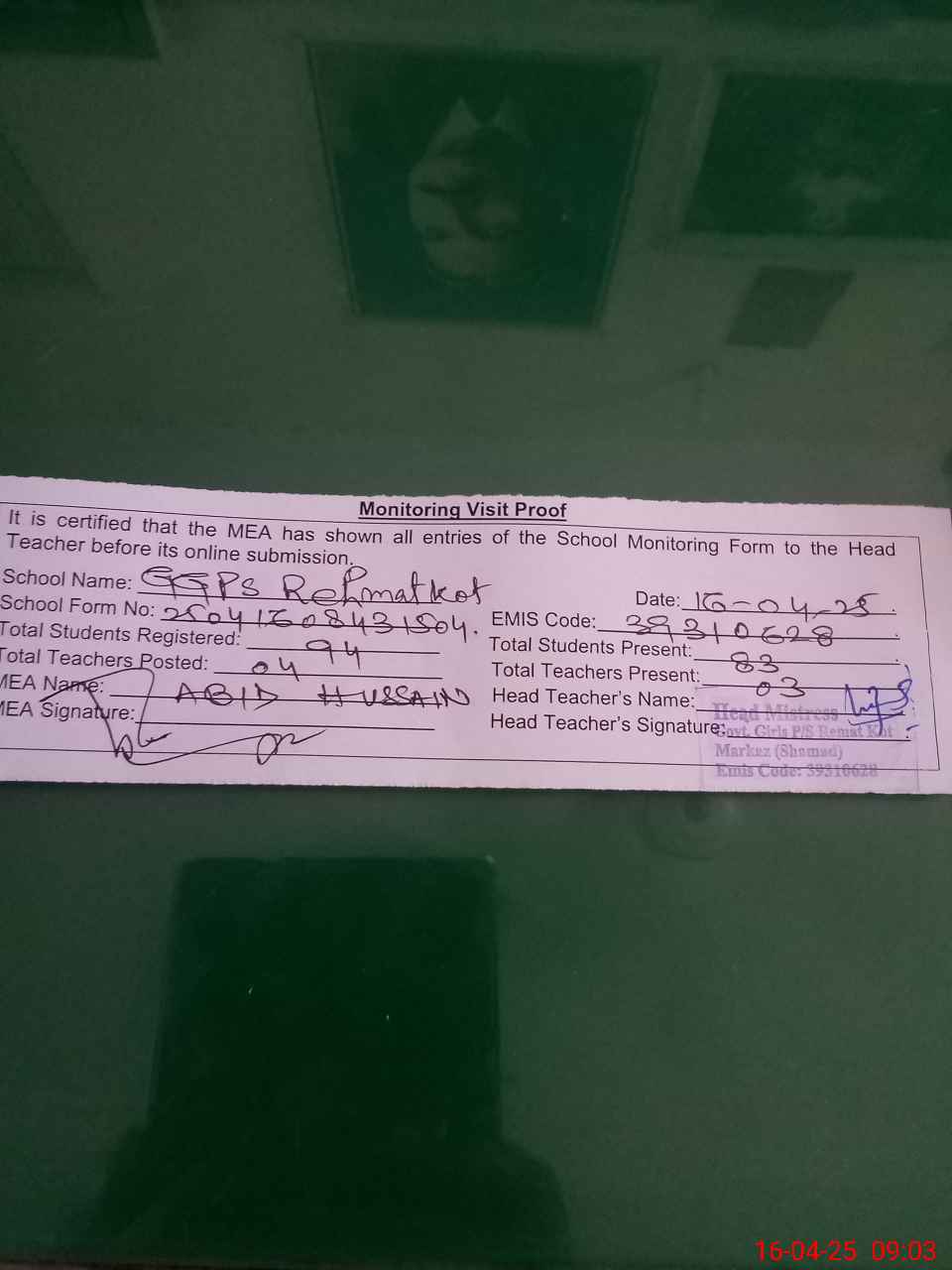| EMIS Code: 39310628 | Name of School: GGPS REHMAT KOT | |||