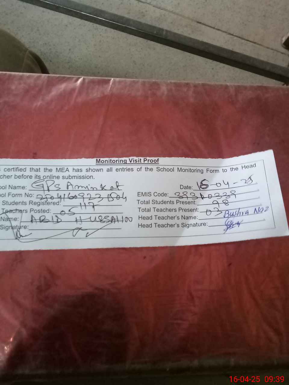 | EMIS Code: 39310339 | Name of School: GPS AMIN KOT | |||