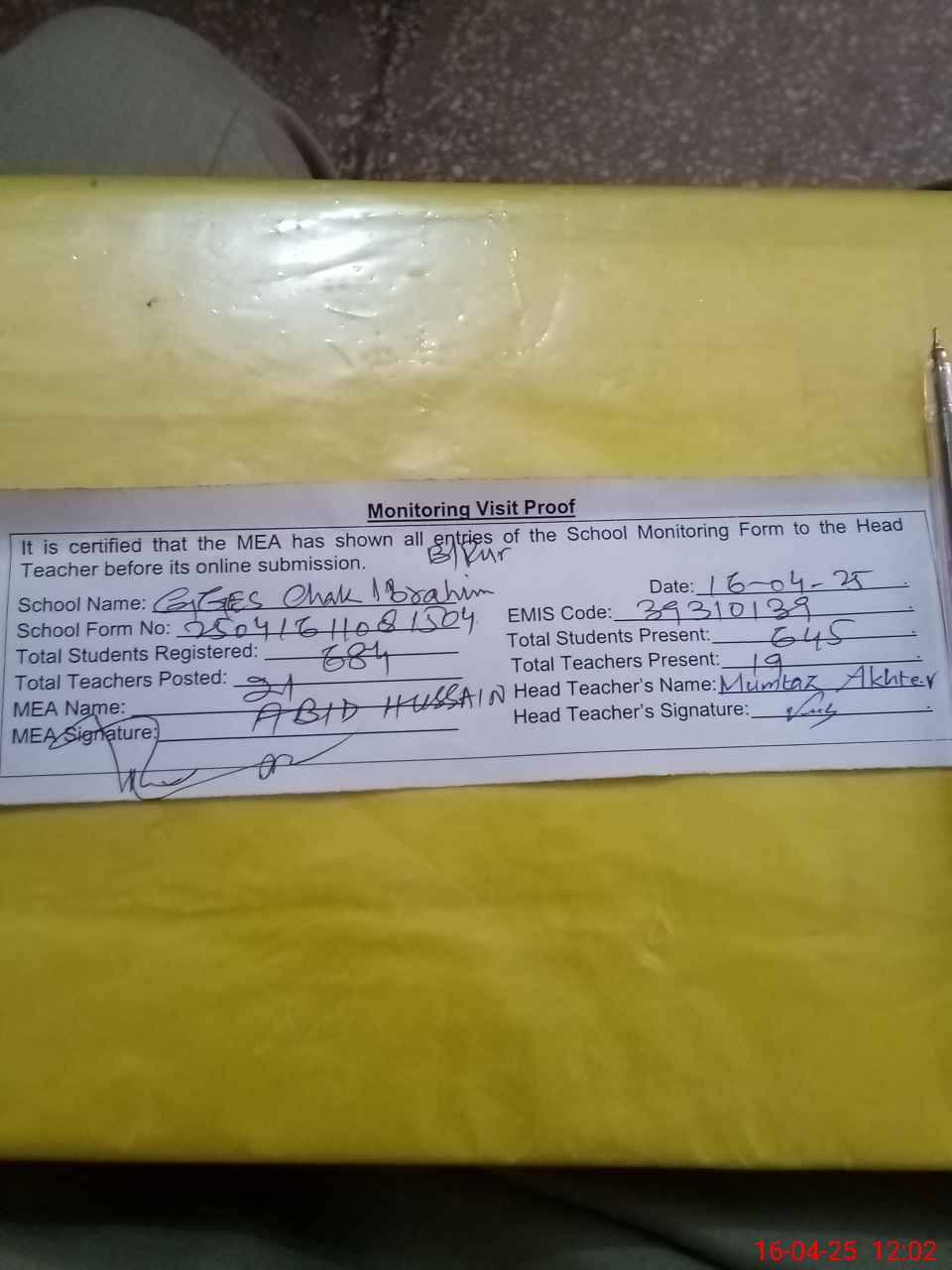 | Attendance Register | Head Teacher | MEA with School | Visit Proof |