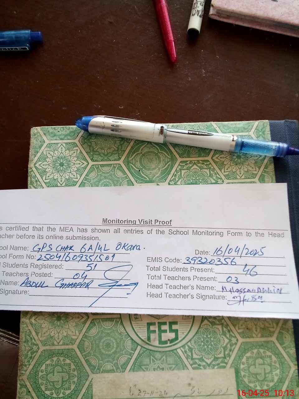 | Attendance Register | Head Teacher | MEA with School | Visit Proof |