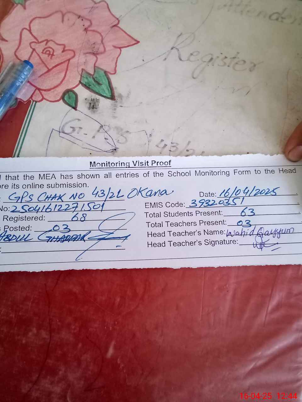 | Attendance Register | Head Teacher | MEA with School | Visit Proof |