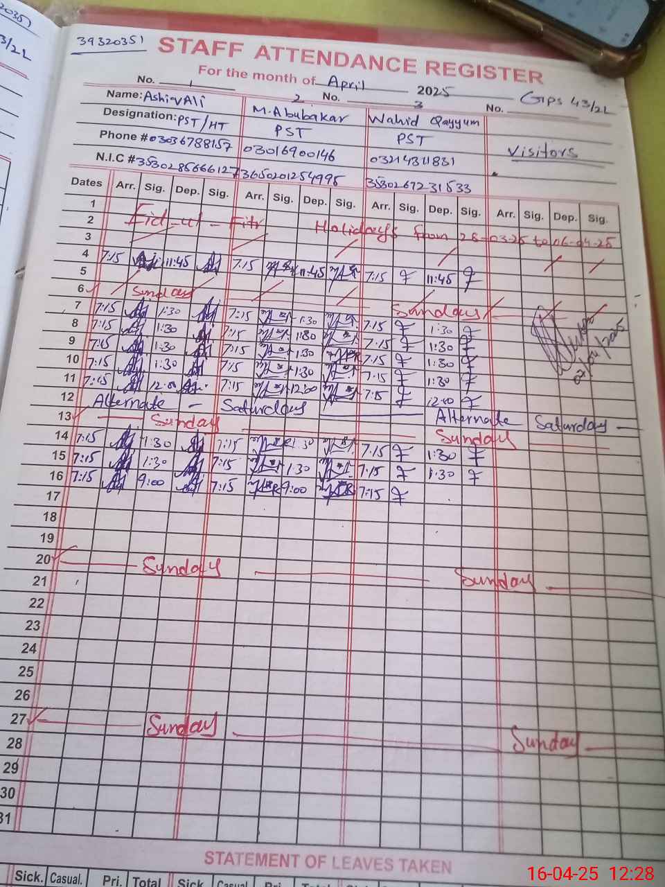 | Name: As**** Al**** Designation: (School Headmaster's/Headmistress's) PST Phone/Cell Number: 03**** |