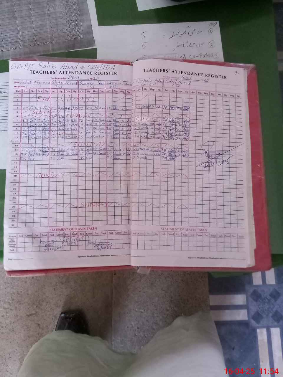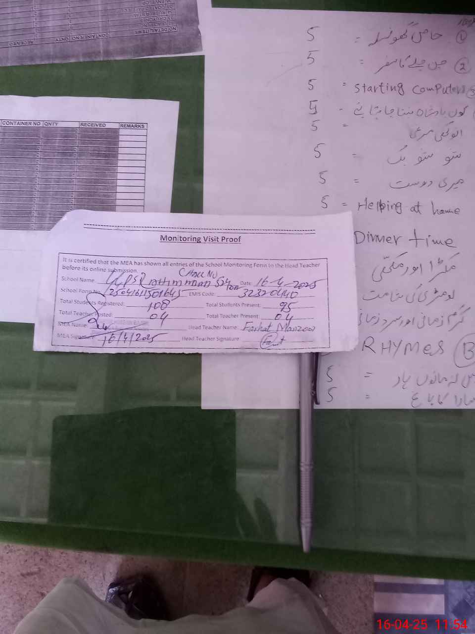 | Attendance Register | Head Teacher | MEA with School | Visit Proof |