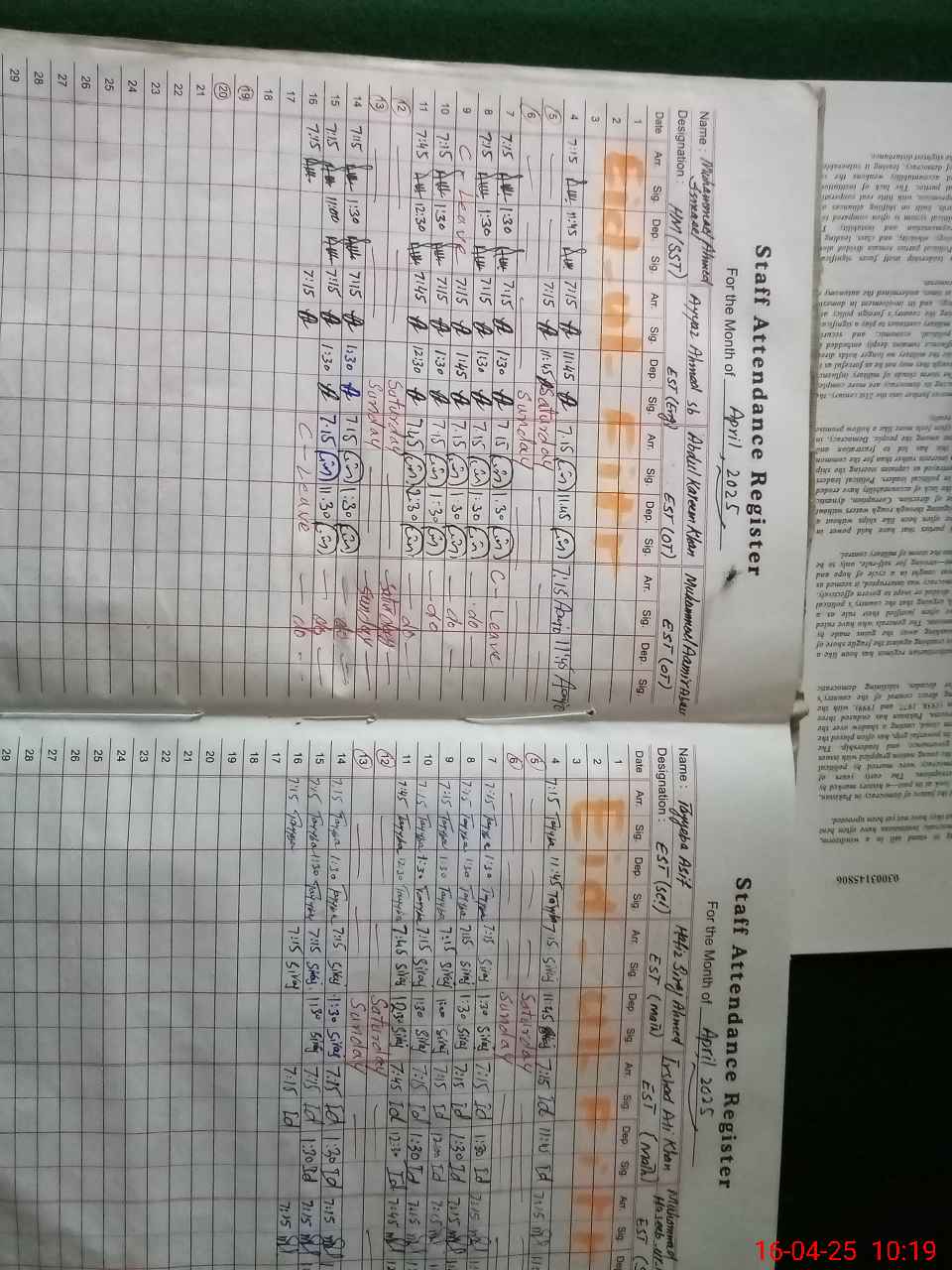 | CNIC | Full Name | Designation | R/C | Absence During Last Calender Month |