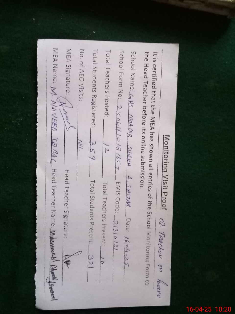 | Attendance Register | Head Teacher | MEA with School | Visit Proof |