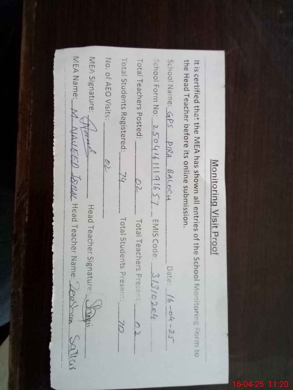 | Attendance Register | Head Teacher | MEA with School | Visit Proof |