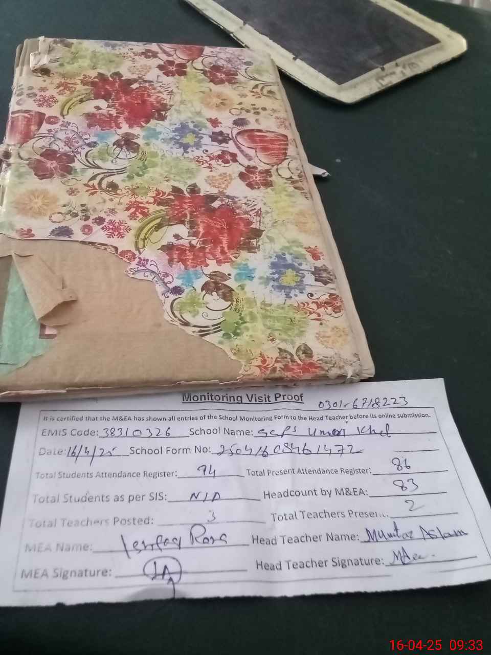 | Attendance Register | Head Teacher | MEA with School | Visit Proof |