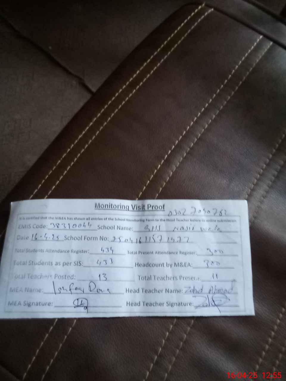 | Attendance Register | Head Teacher | MEA with School | Visit Proof |