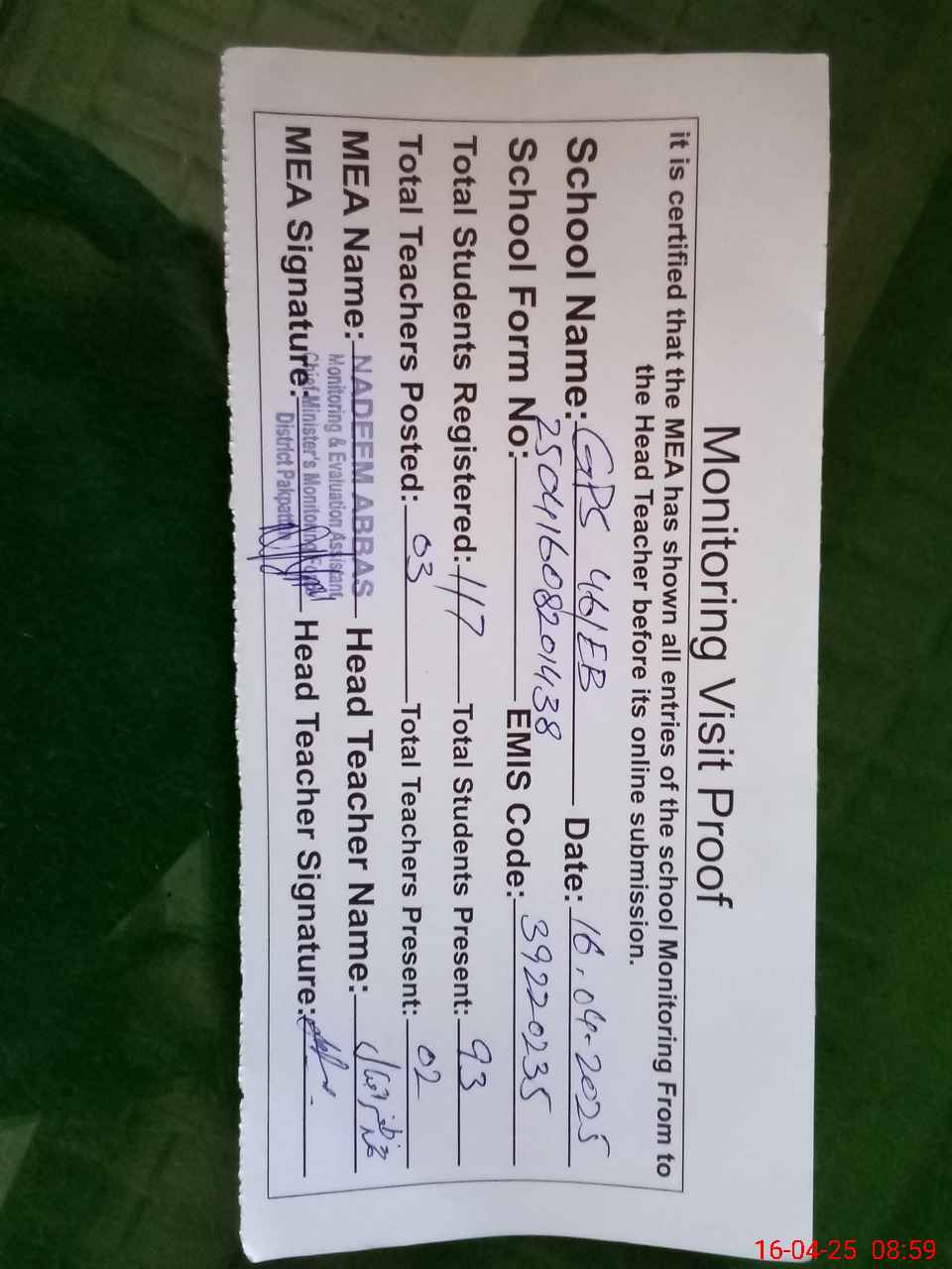 | Attendance Register | Head Teacher | MEA with School | Visit Proof |