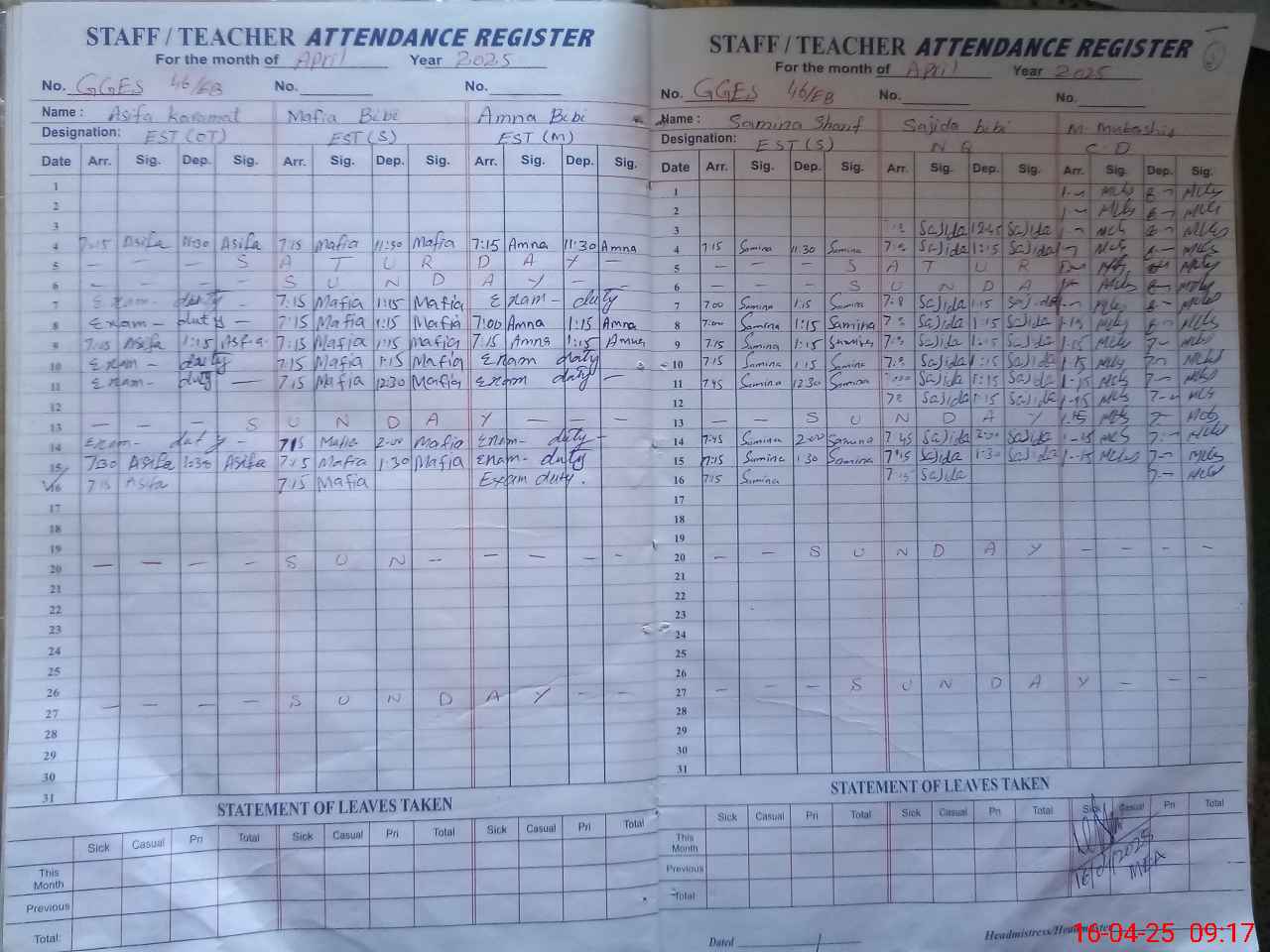 | 36**** | Su**** Sa**** | Contract | 0 | 7 | 0 | 0 | 0 | 0 | 0 | 0 | 0 | Exam Duty | |