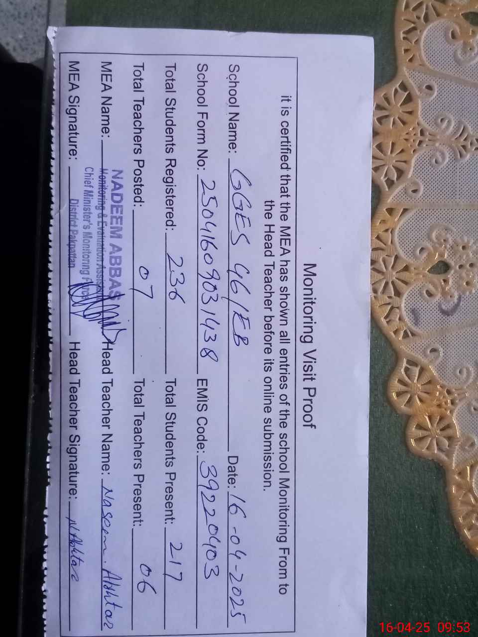 | Certified that this School was Inspected by the Undersigned MEA/DMO Today and the Information Stated Above is as Per Record. | |||||