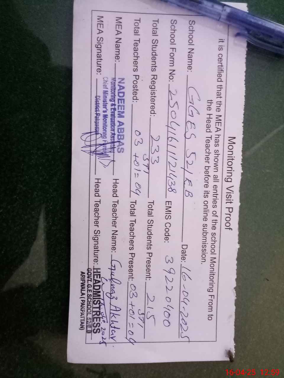 | Remarks (Use Separate Page if Required): Note 01 STI teacher named tahira Ramzan was present in school | |||||