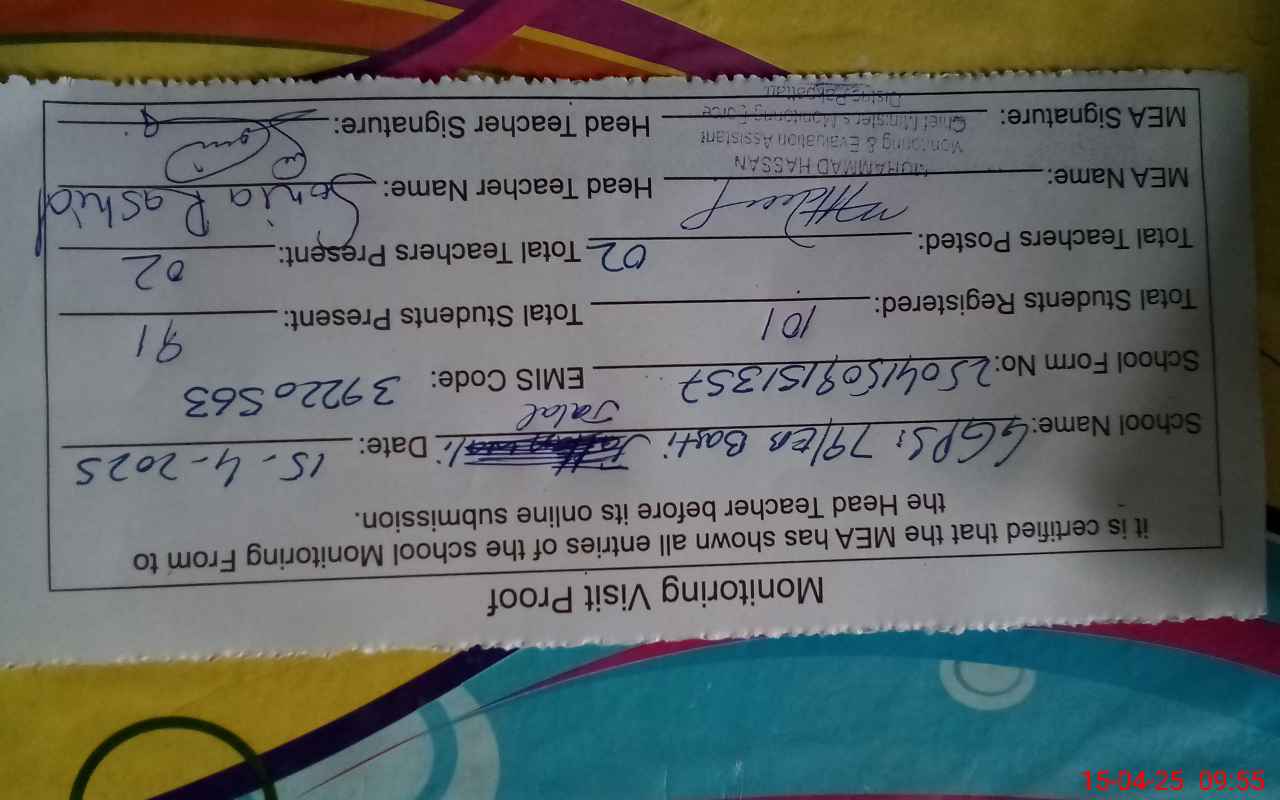 | EMIS Code: 39220563 | Name of School: GGPS 79/EB III basti jalal | |||