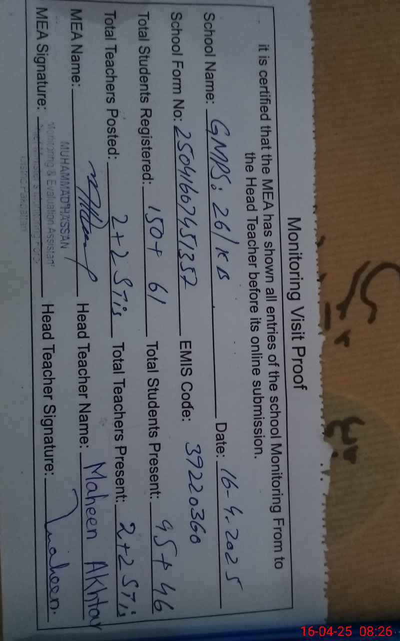| EMIS Code: 39220360 | Name of School: GMPS CHAK NO 26 KB | |||