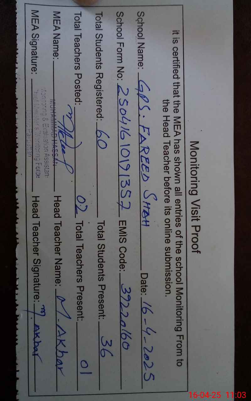 | EMIS Code: 39220160 | Name of School: GPS FARID SHAH | |||