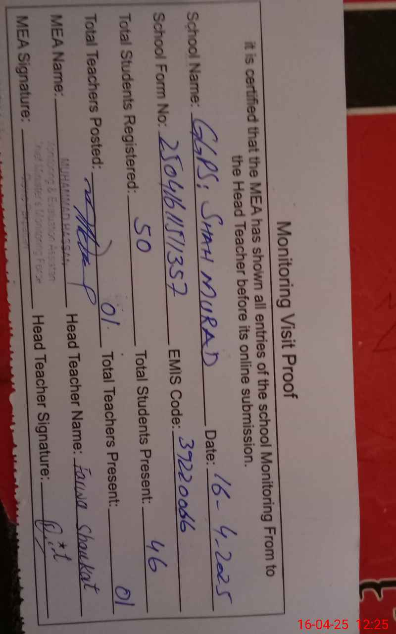 | EMIS Code: 39220066 | Name of School: GGPS SHAH MURAAD | |||
