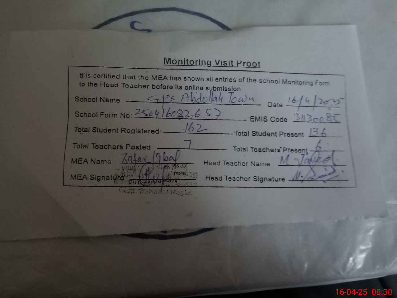 | Attendance Register | Head Teacher | MEA with School | Visit Proof |